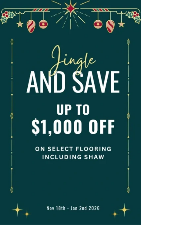 It's time for the holiday, and we want to you to enjoy cool savings with new floorings during our Jingle and Save sale! Take advantage of savings on select Shaw flooring products! Sign up for your coupon today and save now through January 2, 2026. Whether you're interested in carpet, hardwood, luxury vinyl, or more, our team is ready to help! This coupon is valid on first-quality qualifying styles--materials only, excluding trim, pad, and underlayment. Pricing is determined by the retailer. Ask a store associate for details and qualifying styles. This coupon entitles you to receive 10% off any qualifying flooring purchase up to $10,000, for a maximum savings of up to $1,000 off. Coupon is non-transferable. Returns of any portion of the purchase will require equal forfeiture of the offer or amount equal to the offer. Save $100 for every $1.000 spent, up to $1,000. Usage of the coupon is limited to consumers and is not valid for business-to-business transactions. This coupon is an offer by participating Shaw Flooring Network retailers; Shaw is not responsible for the fulfillment of the coupon. Coupon must be presented before or at the time of purchase, not after transaction. Coupon has no cash value. Consumer must pay any sales tax. Void where regulated and prohibited by law. Coupon may not be duplicated or used more than once. Limit one coupon per household. This coupon is valid only on qualifying purchases between November 18, 2025 - January 2, 2026. Coupon cannot be combined with any other coupon, sale, or offer. Special financing may be available at participating retailers, pending credit approval on purchase of qualifying flooring products.